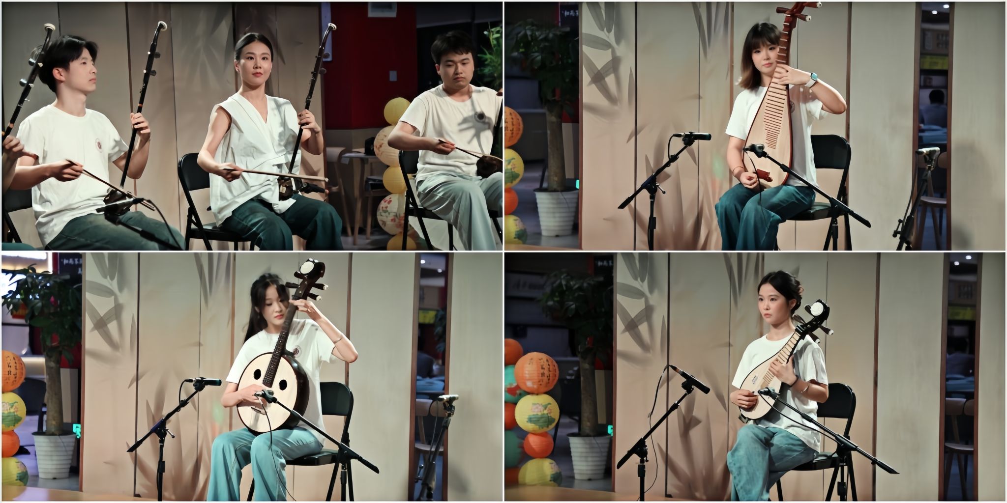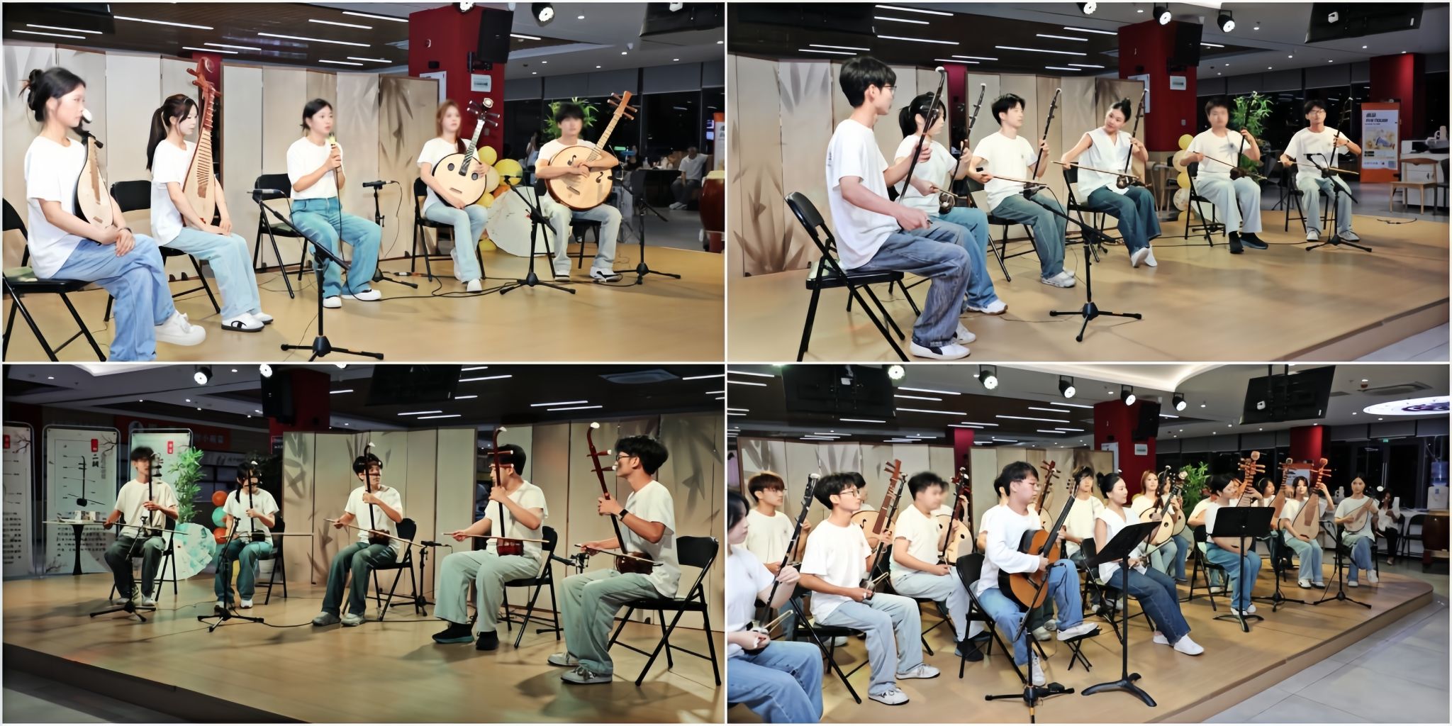 下半场以中阮独奏《满江红》重温英雄壮怀,柳琴独奏《映山红》点燃红色记忆,中阮合奏《萱草花》以温柔旋律传递家国温情。压轴曲目《十送红军》合奏汇聚全体演奏者,琴瑟和鸣间再现军民鱼水情,将现场氛围推向高潮。